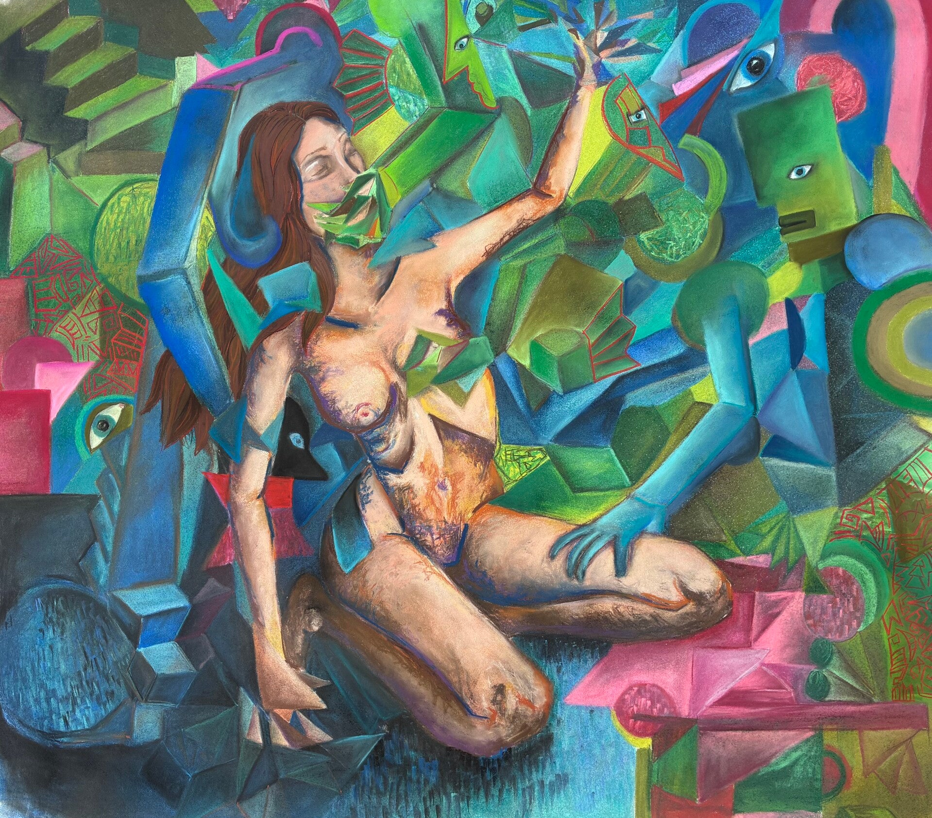 It Is All Men is intended to speak about post-traumatic stress disorder (PTSD) from sexual violence through the medium of dry pastel. Using a cubist approach, I created a fragmented background, mirroring the disjointed nature of trauma. The work portrays a young woman on her knees, one arm reaching out, protectively, the other pressing against the ground for stability. Fragmented bodies reach toward her, breaking apart her form where they make contact. The color palette centers on greens and blues, with intentional points of pink that guide the eye to moments of emotional intensity.